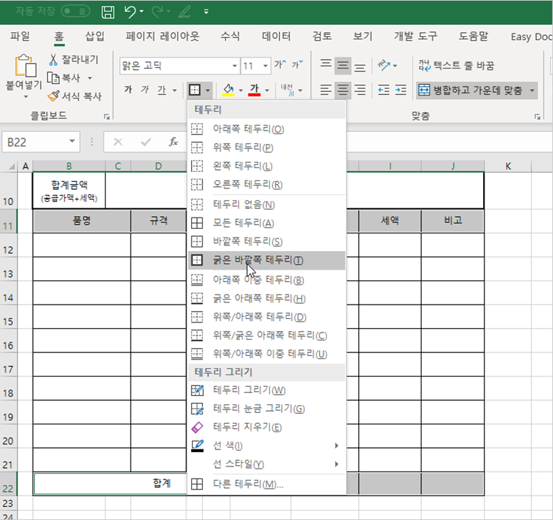 견적서 전체 범위 [B2:J22] 셀 범위를 선택하고 [홈] 탭 → [글꼴] 그룹 → [테두리] → [다른 테두리]를 선택합니다.