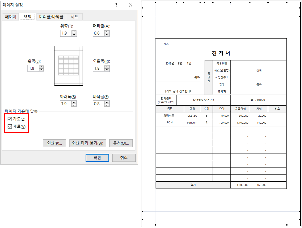 다시 인쇄를 실행하면 용지에 견적서 양식이 정 가운데로 정렬되어 인쇄됩니다.