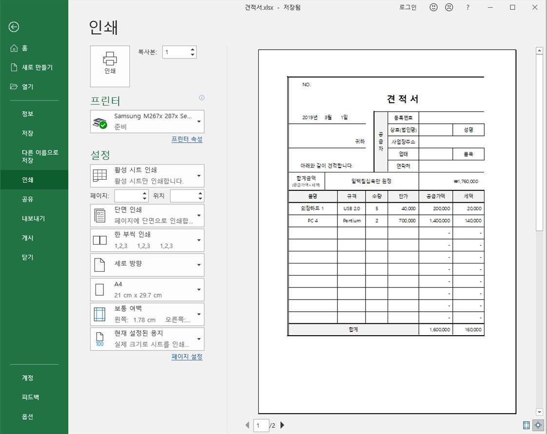 이대로 인쇄하면 견적서의 일부분이 잘려서 나오겠네요.