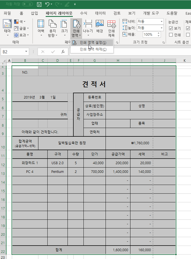 견적서 양식 범위만 선택한 후 [페이지 레이아웃] 탭 → [페이지 설정] 그룹 → [인쇄 영역] → [인쇄 영역 설정]을 선택하세요.