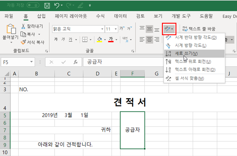 4. [F5] 셀에 ‘공급자’ 라고 입력하고 [홈] 탭 → [맞춤] 그룹 → [병합하고 가운데 맞춤]을 적용하고 [방향] → [세로 쓰기]를 선택하고 [F] 열 너비를 줄여줍니다.