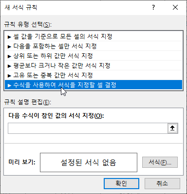 3. [새 서식 규칙] 대화상자가 열리면 [규칙 유형 선택]에서 [수식을 사용하여 서식을 지정할 셀 결정]을 선택합니다.