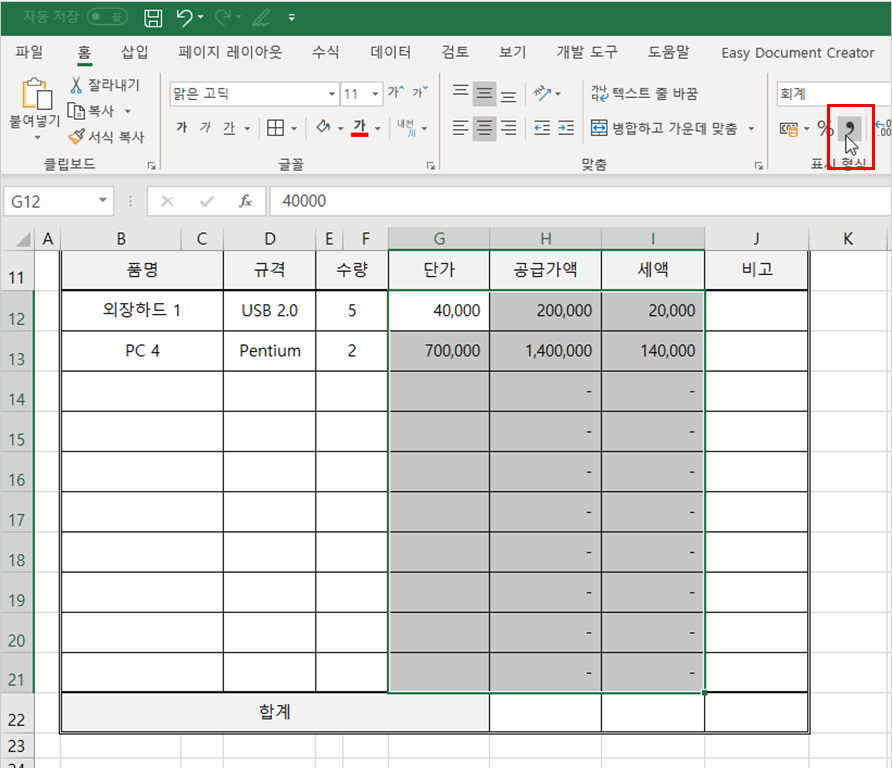 합계 금액에 표시 형식 적용하기