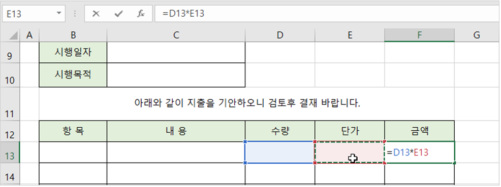 1. 금액을 구할 [F13] 셀을 선택하고 =을 입력한 다음 수량 셀 [D13] 셀을 지정하고 *(곱하기)를 입력한 다음 단가 셀 [E13]을 지정하고 <Enter>를 누릅니다.