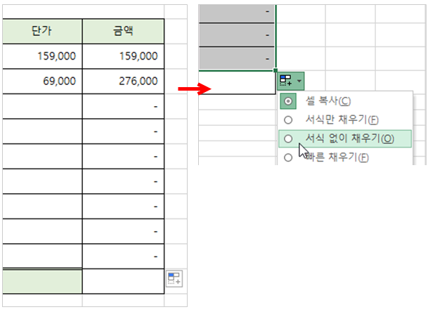 이런 경우 [채우기] 옵션을 눌러 [서식 없이 채우기]를 선택하면 됩니다.