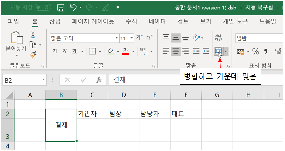 2. [B2:B3] 셀 범위를 선택하고 [홈] 탭 → [맞춤] 그룹 → [병합하고 가운데 맞춤]을 선택합니다.