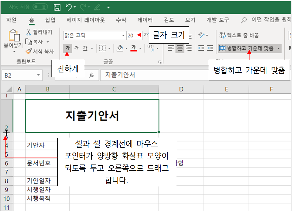 2. [B2] 셀을 선택하고 ‘지출기안서’ 텍스트를 [글자크기] ‘20pt’, [진하게] 설정을 하고