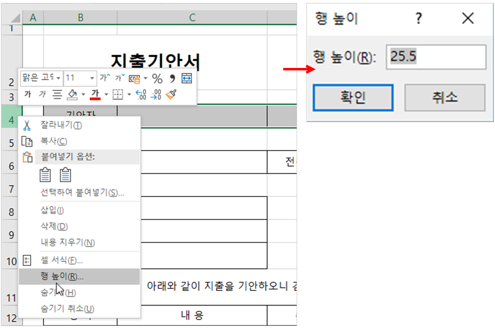 기본값으로 작성된 행 높이는 인쇄를 하면 좁은 감이 있습니다.