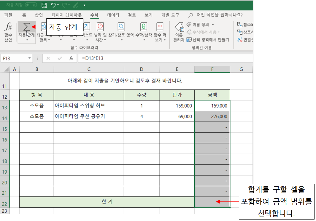 [F13:F22] 셀 범위를 선택하고 [수식] 탭 → [함수 라이브러리] 그룹 → [자동 합계 ∑]를 선택합니다.