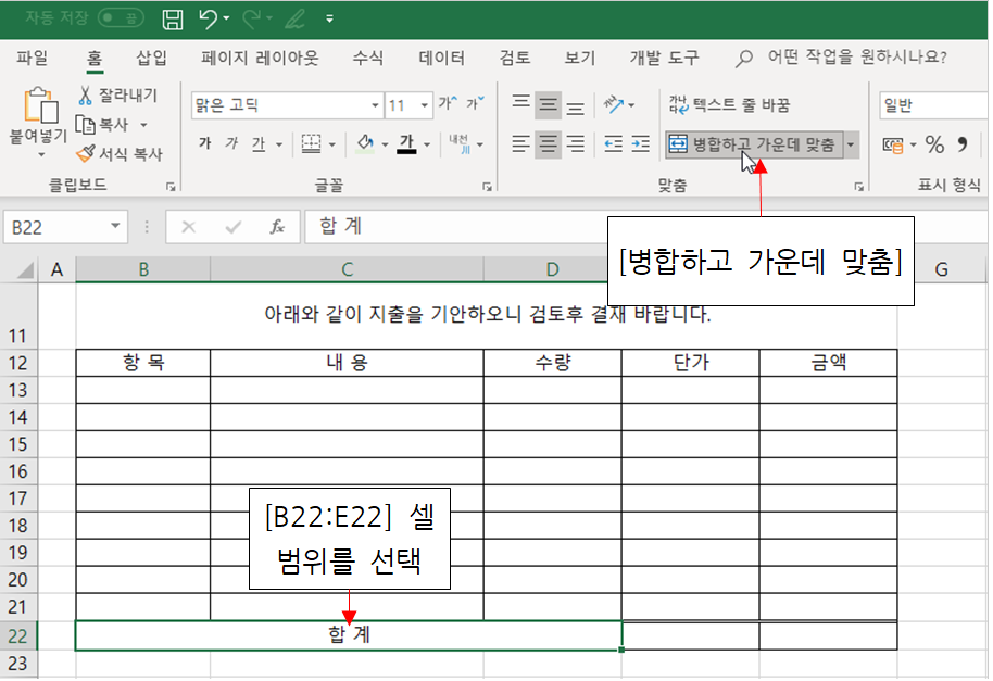 12. [B22:E22] 셀 범위를 선택하고 [홈] 탭 → [맞춤] 그룹 → [병합하고 가운데 맞춤]을 적용합니다.