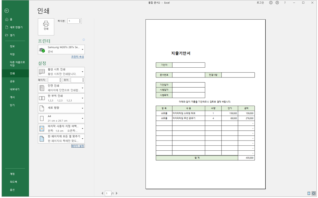 지출기안서 양식만 용지에 인쇄되도록 먼저 인쇄 영역을 설정하겠습니다.