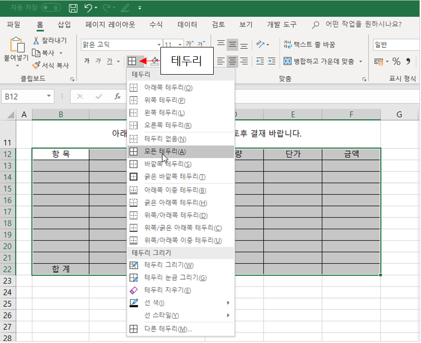 10. [B12:F22] 셀 범위를 선택하고 [모든 테두리]를 적용합니다.