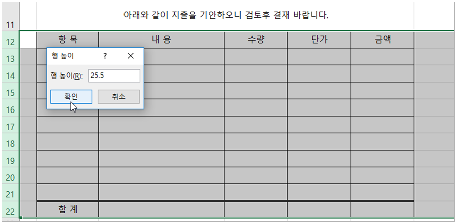 [행 높이] 대화상자가 실행되고 현재 선택한 행 높이를 값으로 확인할 수 있습니다.