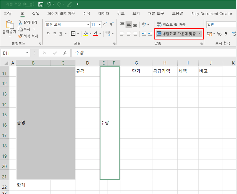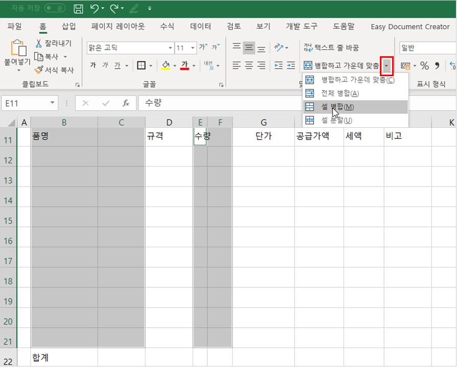 7. 품명과 수량 범위는 두개의 열에 걸쳐서 작성이 되어 있기 때문에 셀들을 각각 합쳐줘야 합니다.