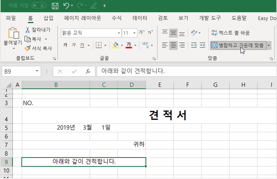 2. [B9] 셀에 ‘아래와 같이 견적합니다.’라고 입력하고 [B9:D9] 셀 범위를 선택한 다음 마찬가지로 [병합하고 가운데 맞춤]을 적용합니다.