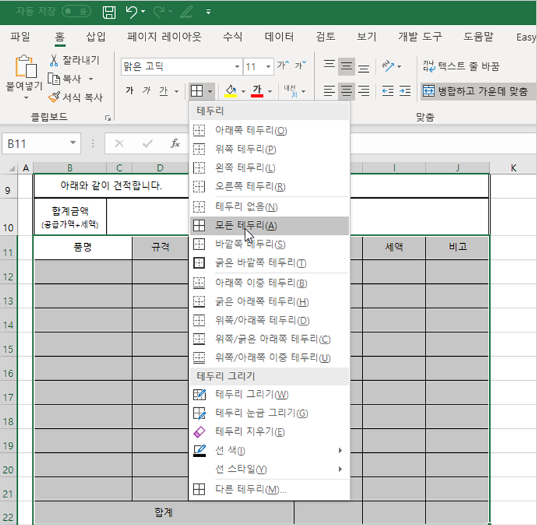 10. [B11:J22] 셀 범위를 선택하고 [홈] 탭 → [글꼴] 그룹 → [테두리] → [모든 테두리]를 선택하여 적용하고 다시 [굵은 바깥쪽 테두리]도 적용합니다.