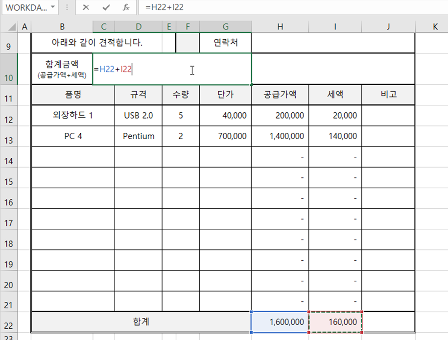 5. 공급가액과 세액을 더해 합계금액을 구하겠습니다. [C10] 셀에 [H22] 셀에 [I22] 셀을 더해줍니다.