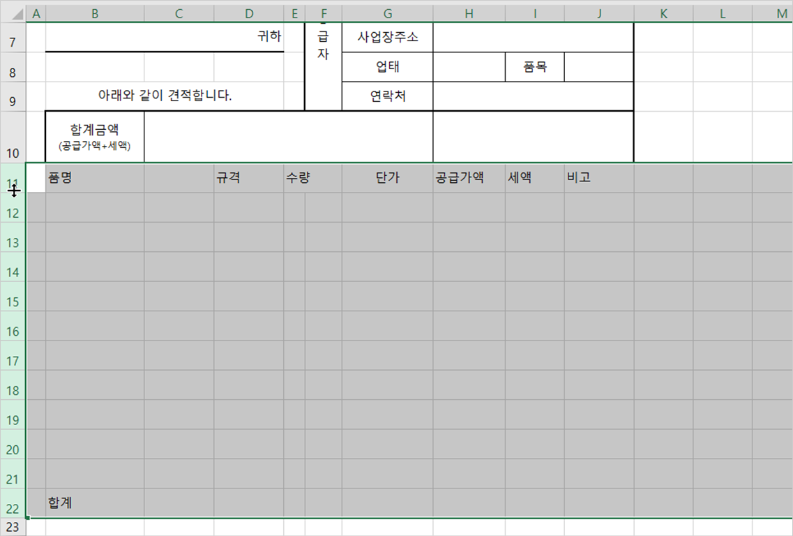 하지만 아직 견적서 모양이 갖추어지지 않았죠? 행 높이도 늘이고 테두리도 설정하면 견적서 형태를 갖추게 될 겁니다.