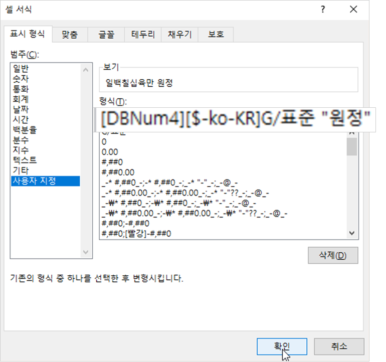 2. [사용자 지정] 범주를 다시 선택한 후 [형식] 입력 창에 ‘[DBNum4][$-ko-KR]G/표준’ 오른쪽에 한 칸 띄운 후 ‘원정’이라고 입력합니다 .