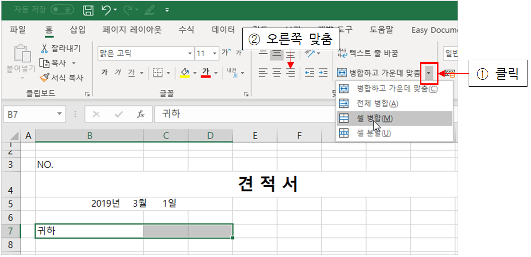 셀을 합치고 오른쪽으로 정렬해 보겠습니다.