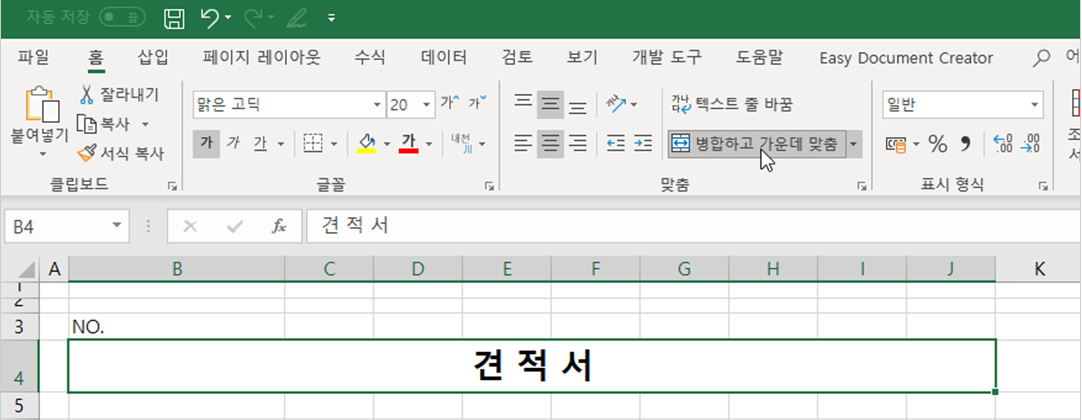 [B4] 셀에 ‘견 적 서’라고 입력하고 [홈] 탭 → [글꼴] 그룹 → [글꼴 크기] ‘20’, [굵게]를 적용하고 [B4:J4] 셀 범위를 선택하고 [홈] → [맞춤] 그룹 → [병합하고 가운데 맞춤]을 선택합니다.