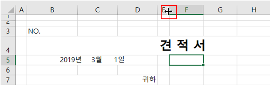 3. [B] 열 너비를 조금 줄이고 [E] 열 너비도 아래와 같이 줄여줍니다.