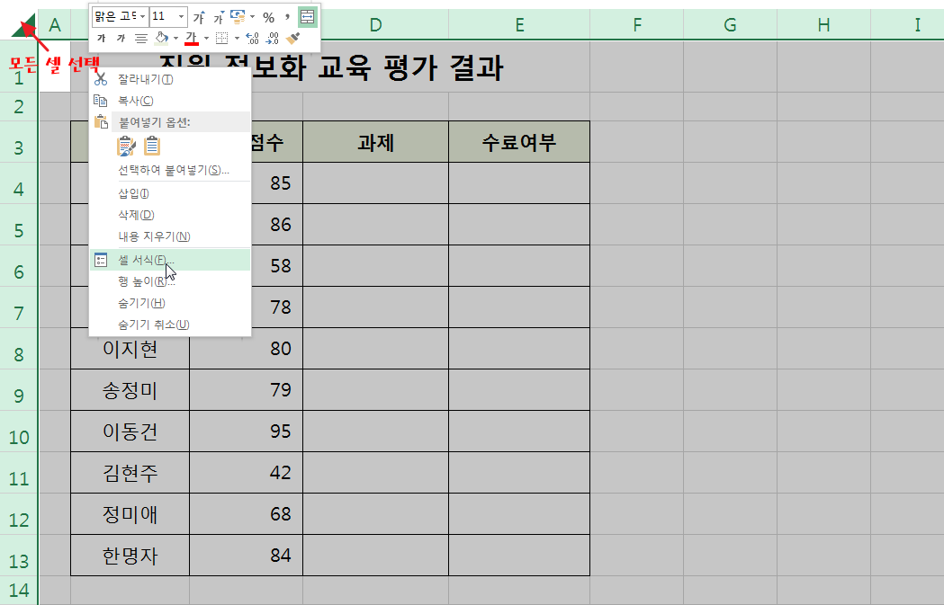 과제 범위(D4:D13)를 지정하고 마우스 오른쪽 버튼을 눌러 [셀 서식] 메뉴를 선택합니다.