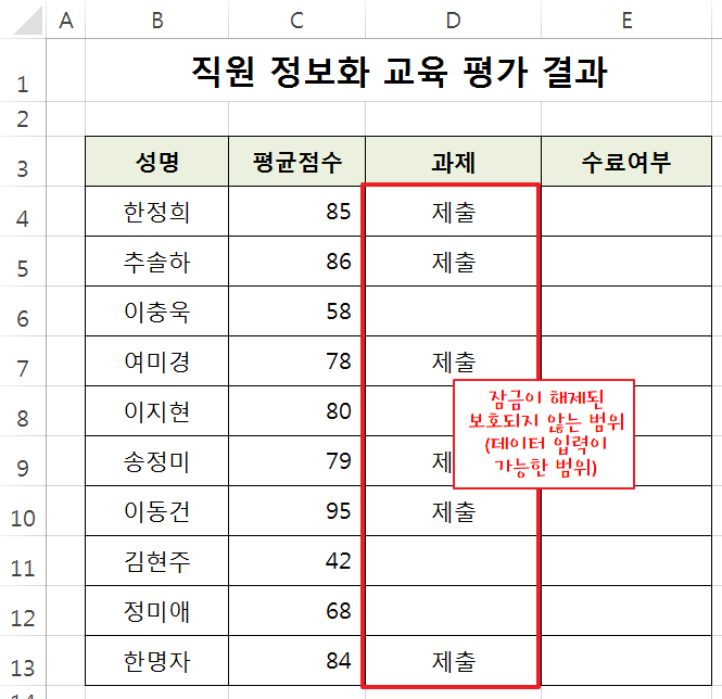 직원 정보화 교육 평가 결과 데이터에서 평균 점수까지 처리하고 문서를 공유하여 과제 제출 여부를 입력 받으려고 합니다. 이때 과제 제출 범위를 제외하고 나머지 범위를 보호 하겠습니다.