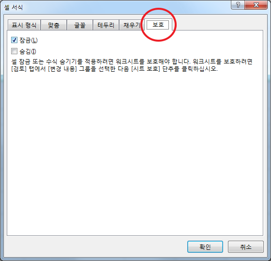 [보호] 탭을 선택하고 잠금 체크 항목에 체크 해제하고 확인 버튼을 누릅니다.