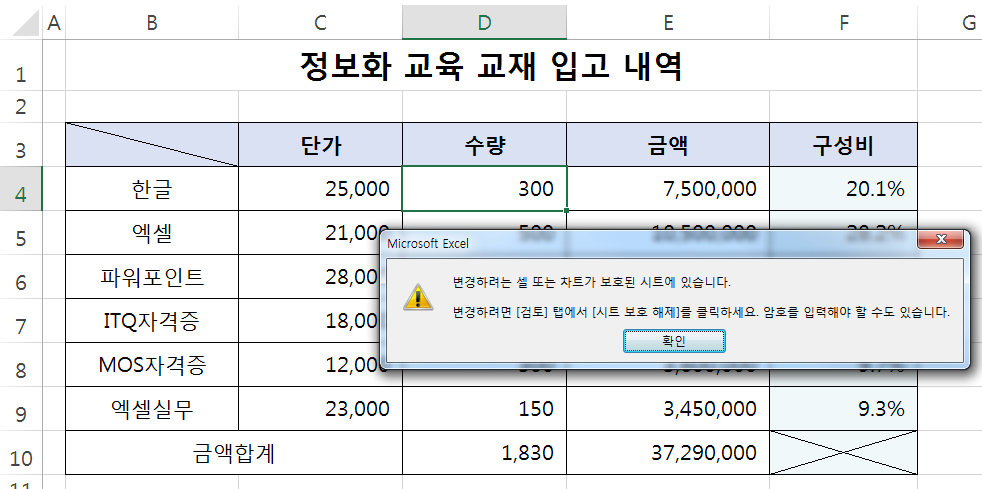 수량을 수정하려고 키보드를 누르는 순간 보호된 시트라는 메시지가 뜹니다.