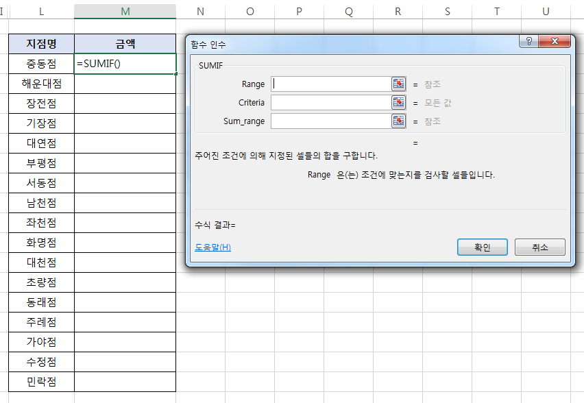 첫 번째 인수 Range에는 일자별 판매내역에 있는 지점명 범위를 지정합니다.