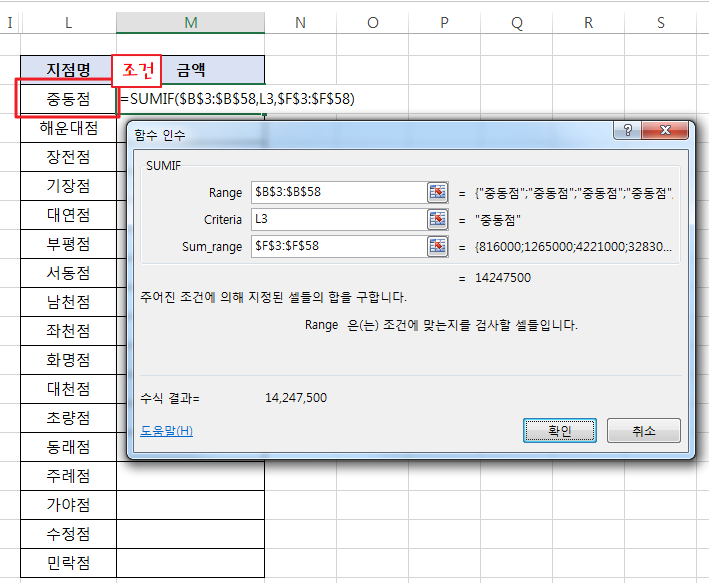 두 번째 인수는 조건을 입력합니다. 집계표의 첫 번째 지점명 셀입니다.
