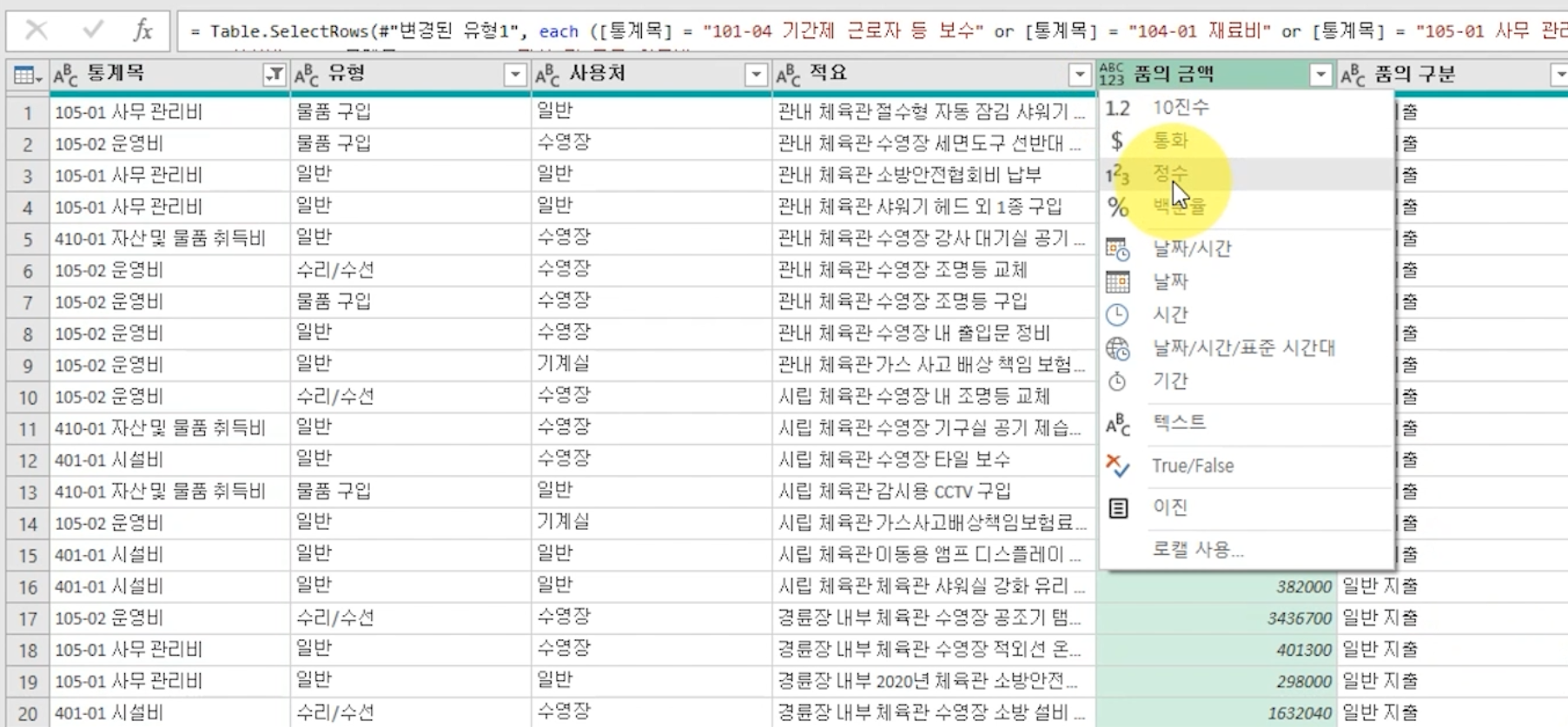 '통계목'에서 '적요'까지는 텍스트 형식이 맞습니다. 그래서 변경할 필요가 없고 '품의 금액'은 [정수]로 변경합니다