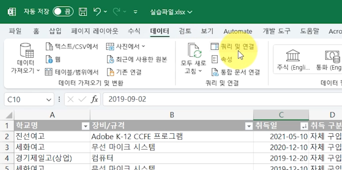 학교명과 장비/규격 필드가 병합되어 있기 때문에 정렬할 수 없습니다. 이 경우에도 파워 쿼리를 활용해 데이터 분석이 가능하도록 전처리를 하면 됩니다.