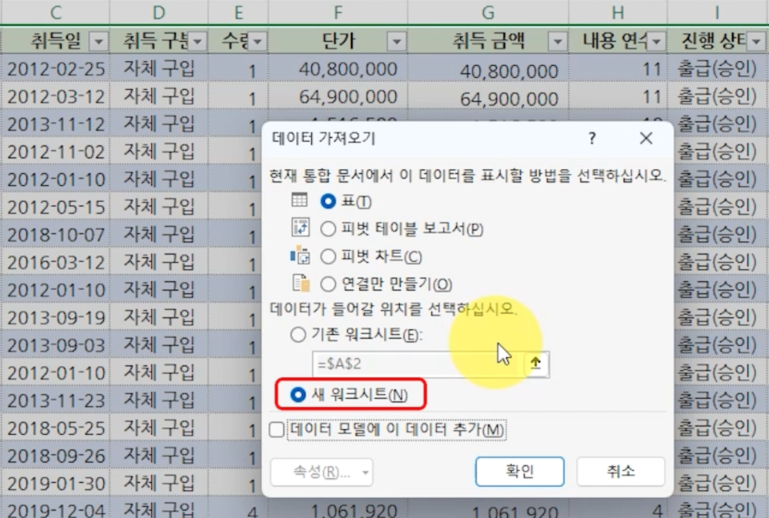워크시트로 데이터를 가져오는 방법 중 '표' 또는 '피벗 테이블 보고서' 등으로 선택할 수 있습니다.