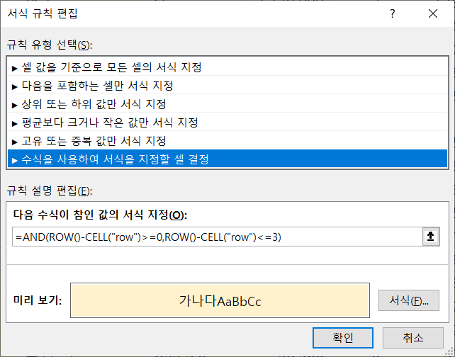 행 부분에 적용할 규칙을 선택해서 [규칙 편집]을 선택해서 수정합니다.