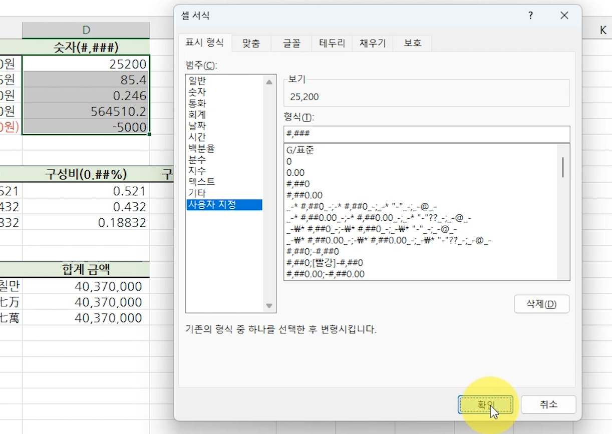 9. 이번에는 [D] 열의 숫자 범위를 선택한 후 [셀 서식]을 실행하고 '사용자 지정' 범주를 선택합니다. 이번에는 형식을 #,###으로 입력하고 [확인]을 누릅니다.