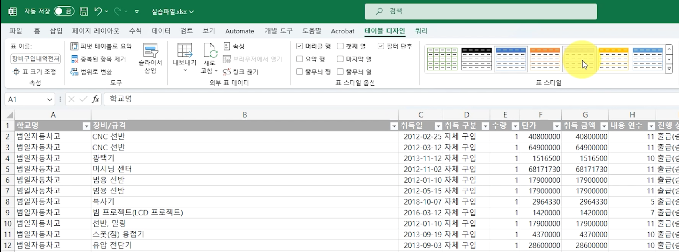 현재 데이터의 문제점은 학교명과 장비/규격명이 같은 경우에 셀이 병합되었죠?