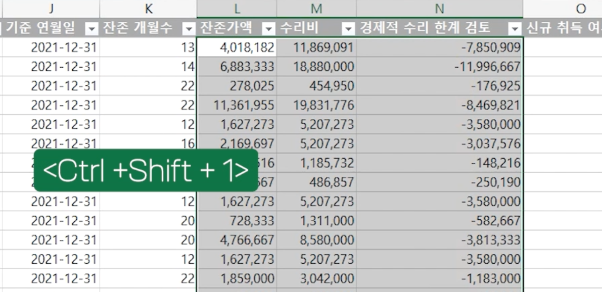 그리고 '잔존가액', '수리비', '경제적 수리 한계 검토' 범위 범위에도 <Ctrl + Shift + 1>을 눌러 쉼표 스타일을 적용합니다.