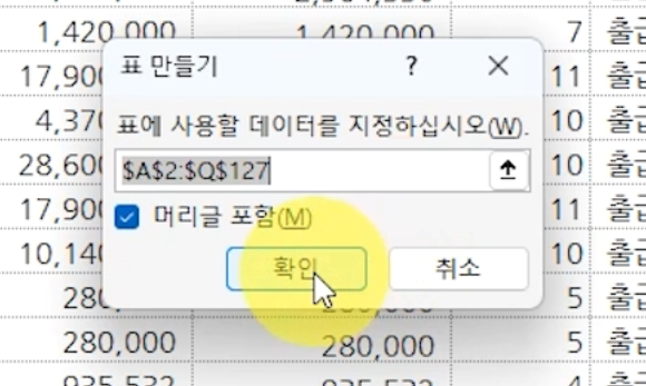 표 만들기가 실행되면 [확인]을 누릅니다.