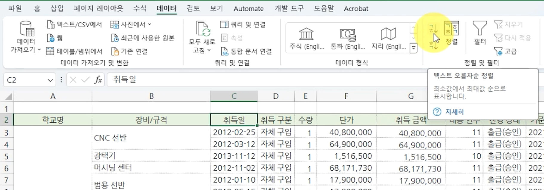 '취득일' 필드에서 임의의 셀을 선택하고 [데이터] 탭 - [정렬 및 필터] 그룹 - [텍스트 오름차순 정렬]을 선택합니다.