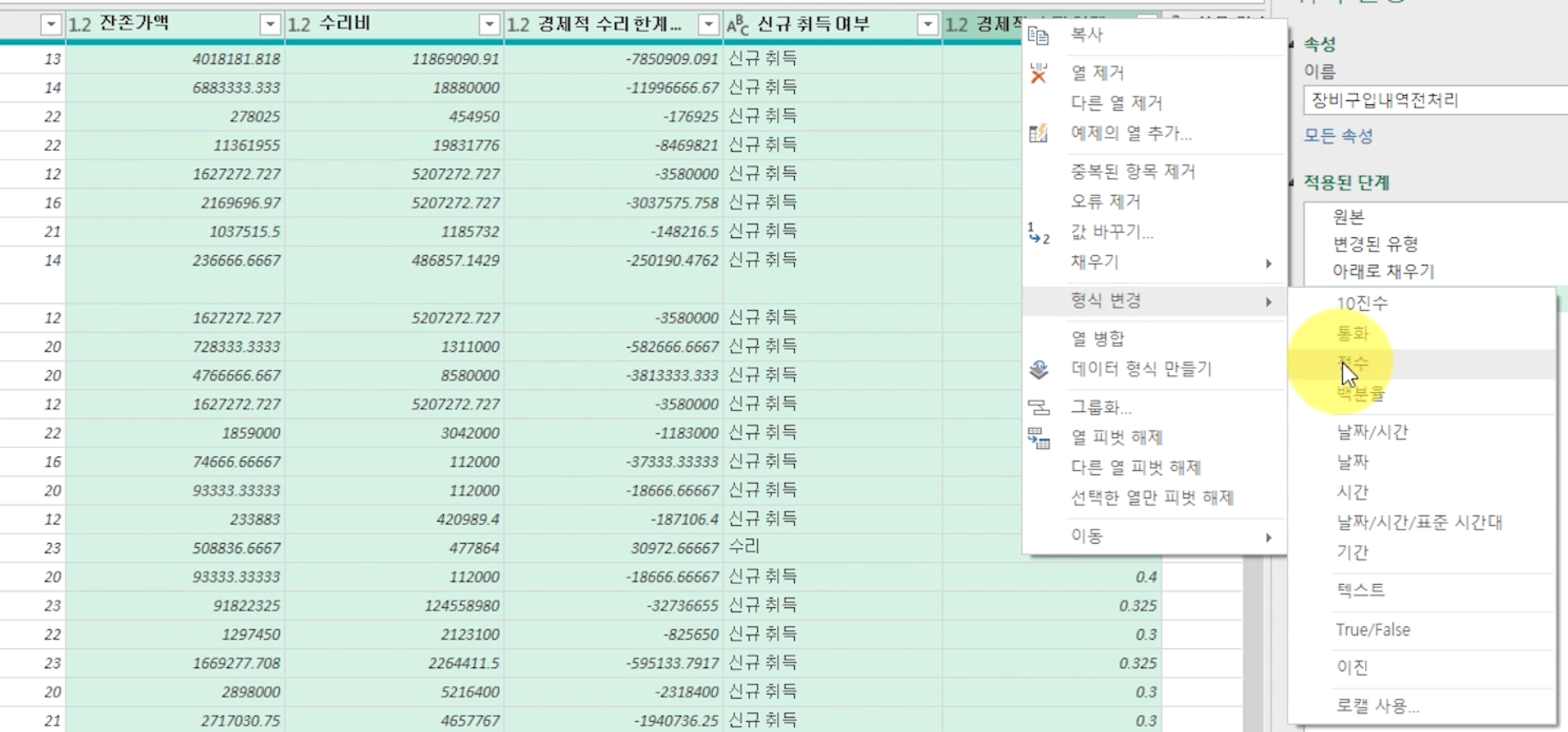 '잔존가액'에서 '경제적 수리 한계'는 선택하고 마우스 오른쪽 버튼을 눌러 [정수]로 변경합니다.