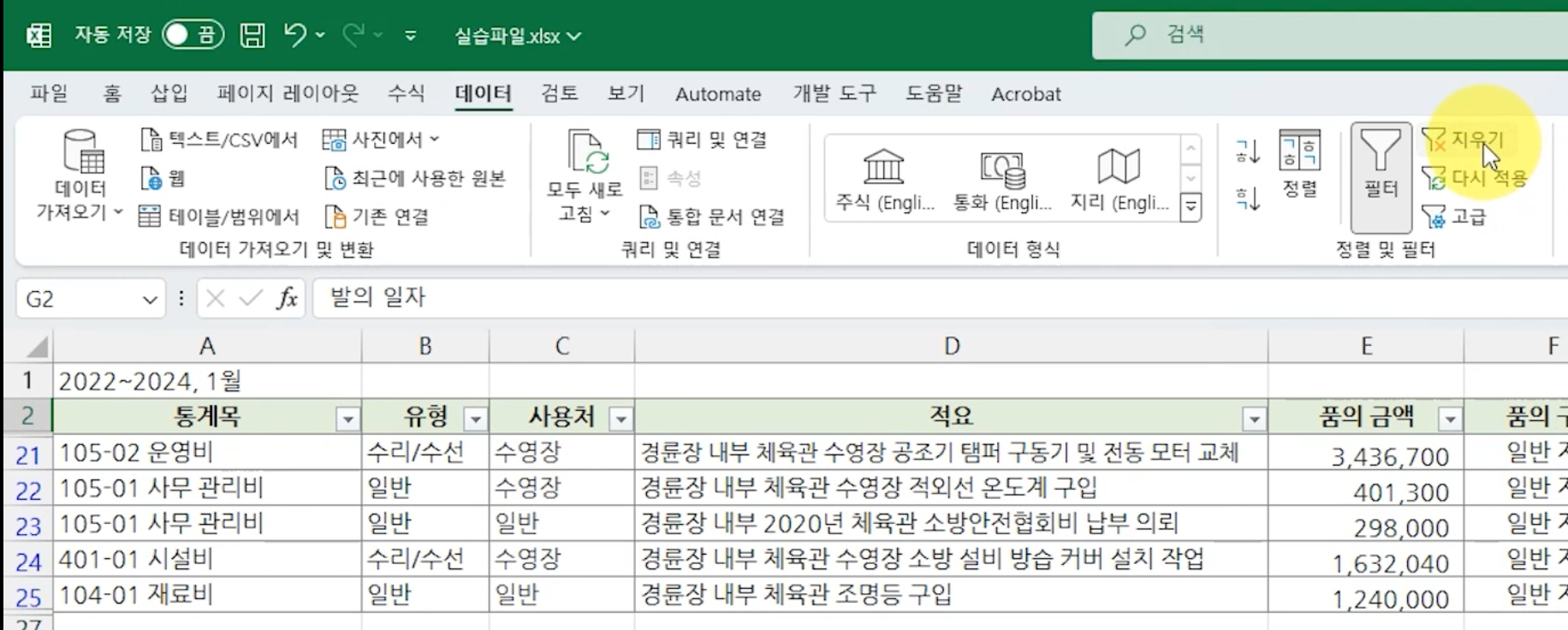 이번에는 연도별 품의 금액의 합계를 나타내는 간단한 피벗 테이블도 작성해 보겠습니다. 먼저 [데이터] 탭을 선택하고 [지우기]를 눌러 필터 결과를 지웁니다.