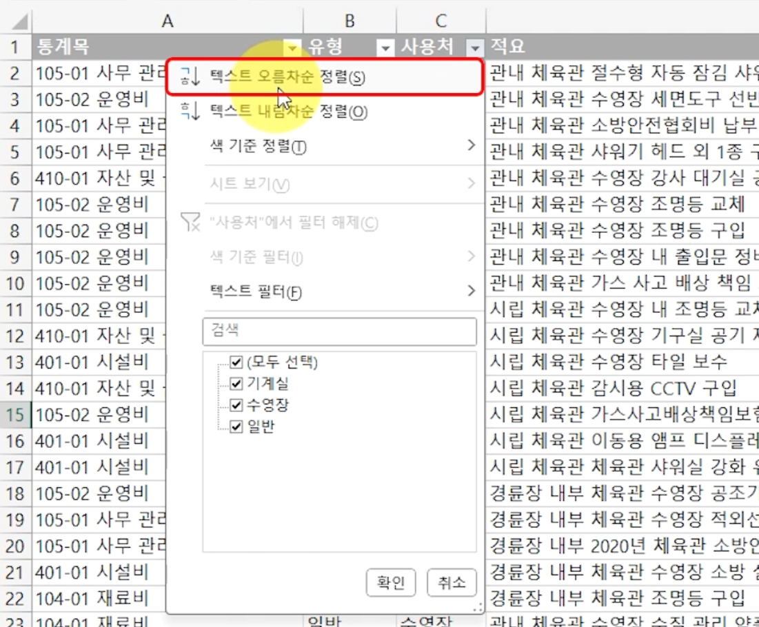 '사용처' 필터 버튼을 누르고 [텍스트 오름처순 정렬]을 하면 기계실, 수영장, 그리고 일반 순서로 데이터가 정렬됩니다. 오류 없이 아주 쉽게 정렬되죠?