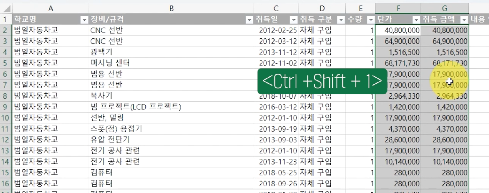 이제 워크시트로 가져온 '단가'와 '취득 금액'의 범위를 선택하고 <Ctrl + Shift + 1>을 눌러 쉼표 스타일을 적용합니다.