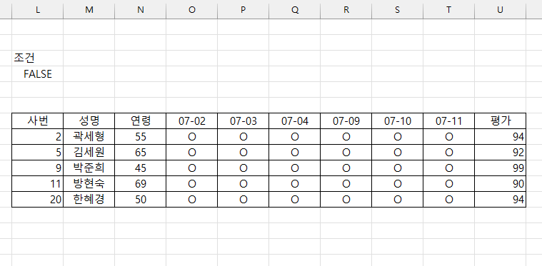 ▶ [A3:J23] 영역에서 출석일수[D3:I3]가 모두 'O'이고 평가가 90 이상인 행을 표시하시오.