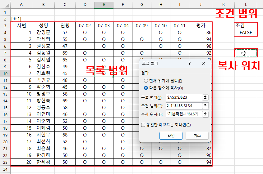 다른 장소에 복사를 선택한 후 활성화된 복사 위치에 결과를 표시할 시작[L7] 셀을 지정하고 [확인]을 누릅니다.