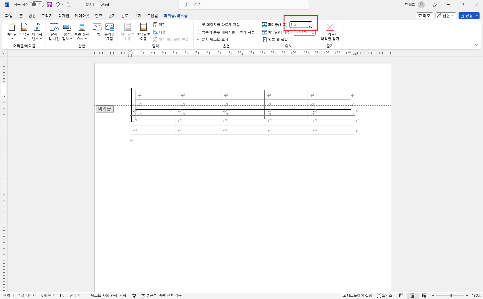먼저 머리글이 나타날 위치를 1cm으로 변경합니다.