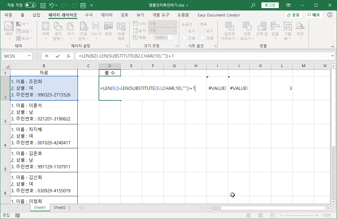한 셀에 몇 줄이 입력되어 있는지 확인할 수 있으니 해결책이라고 할 수도 있지만 모양도 좋지 않고 6줄 미만 확인할 수 있다는 제한 사항이 있죠.