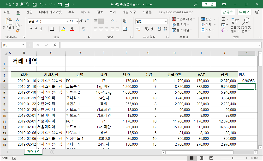 RAND 함수는 인수 없이 그냥 함수이름과 괄호만 입력하면 되고, 역할은 0과 1 사이의 소수값을 임의로 나타냅니다.